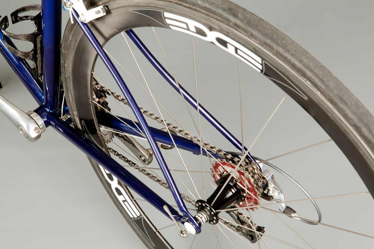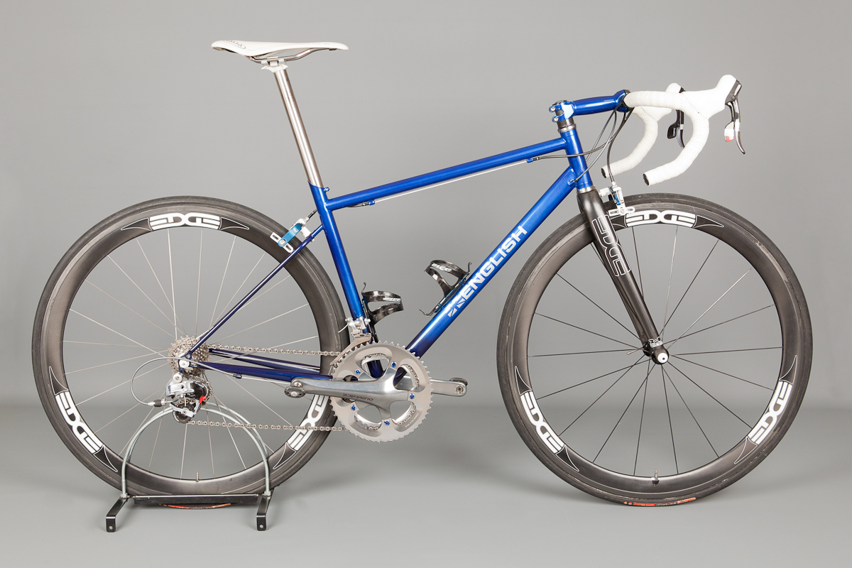 The best of both worlds – a compact steel tubed frame for stiffness with a long titanium seatpost for comfort. Using S3 and Platinum tubes from True Temper, along with machined dropouts and fittings, the frame weight rivals carbon at just 1138g. With a not particularly exotic build (Dura-ace, SRAM Force) and the standard wheels shown, this one weighs in at 15lbs. Or 13.5lbs with EDGE 1.68 carbon wheels. Custom fitted, with road racing geometry, this is a bike that is equally at home in a road race, a century ride or just for a spin on a sunny day….