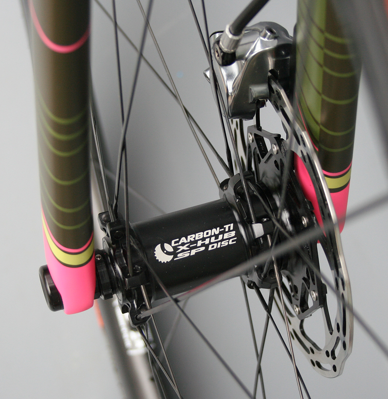 The disc fork is from Enve, slotted into a custom EC headset that doesn’t require an oversize headtube. A custom stem completes the front end. Short (155mm) cranks from Rotor enabled the BB height to be lower to maintain the pedal-ground distance. The light wheel build has Enve 3.4AR rims and Carbon-ti hubs, with 30mm tires for grip and comfort. Shifting and braking is provided by SRAM Red eTap.