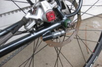This is the bike I have wanted to build for a while, but only recently were all the components I needed readily available – namely integrated drop bar shifters for an internal hub gear and an efficient belt drive. These roles are fulfilled by the Sussex Engineering Versa shifters and the Carbon Drive belt/sprockets respectively. To accommodate the belt drive the frame needed a couple of special features to enable installation and tensioning of the belt, for this I created a split rear dropout for the former and used a Niner eccentric bottom bracket (custom machined to take a 68mm width road BB/crank setup) for the latter. To continue the low maintenance theme, the bike has disc brakes front and rear, mounted on custom post mounts for straight forward fitting. Finally, for my personal use (commuting and winter training) I decided to integrate the rear pannier rack as part of the frame, allowing a small set of panniers to be carried mounted low on the bike and as close to the centreline as possible. Otherwise the bike has regular road geometry, with clearance for 25C tires and fenders. MTB (29er) disc rims provide a wide tire profile for grip on winter roads. Lightweight was never a design intent with this bike, but the final 24lb complete weight is reasonable considering the Alfine hub, heavy duty wheels, rack and fenders.